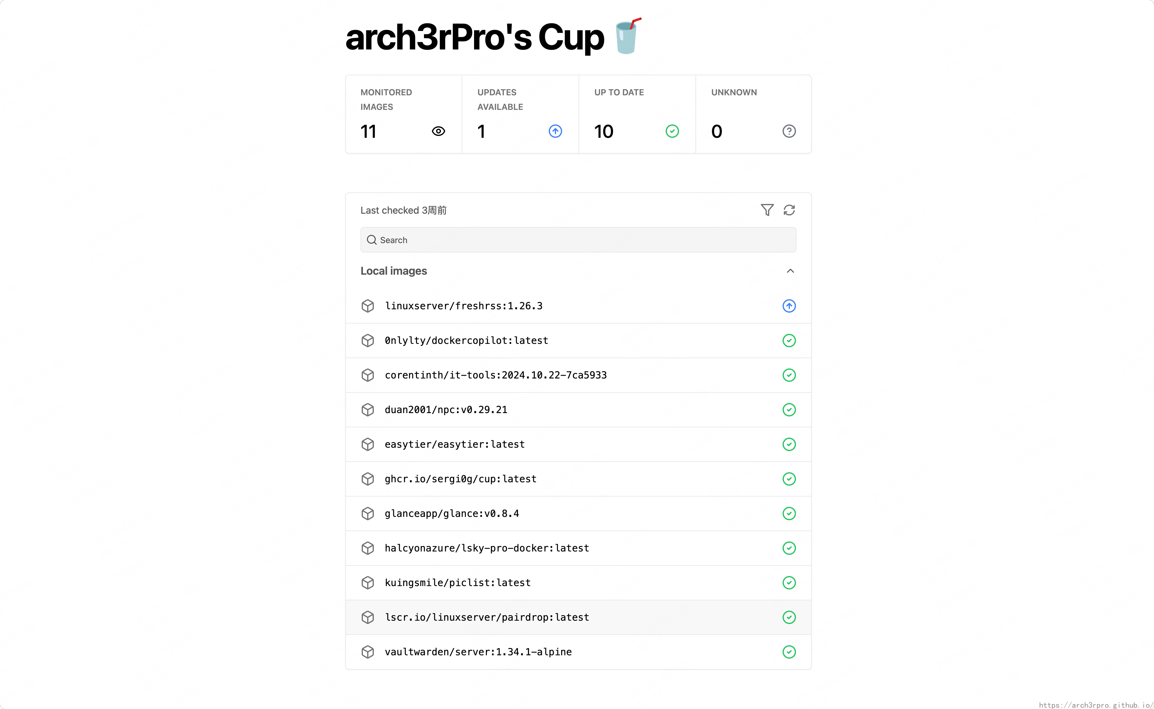 - 不会耗尽任何速率限制。这正是我创建 Cup 的初衷。我觉得这个功能现在尤其重要,因为Docker Hub 正在降低未经身份验证用户的拉取限制。