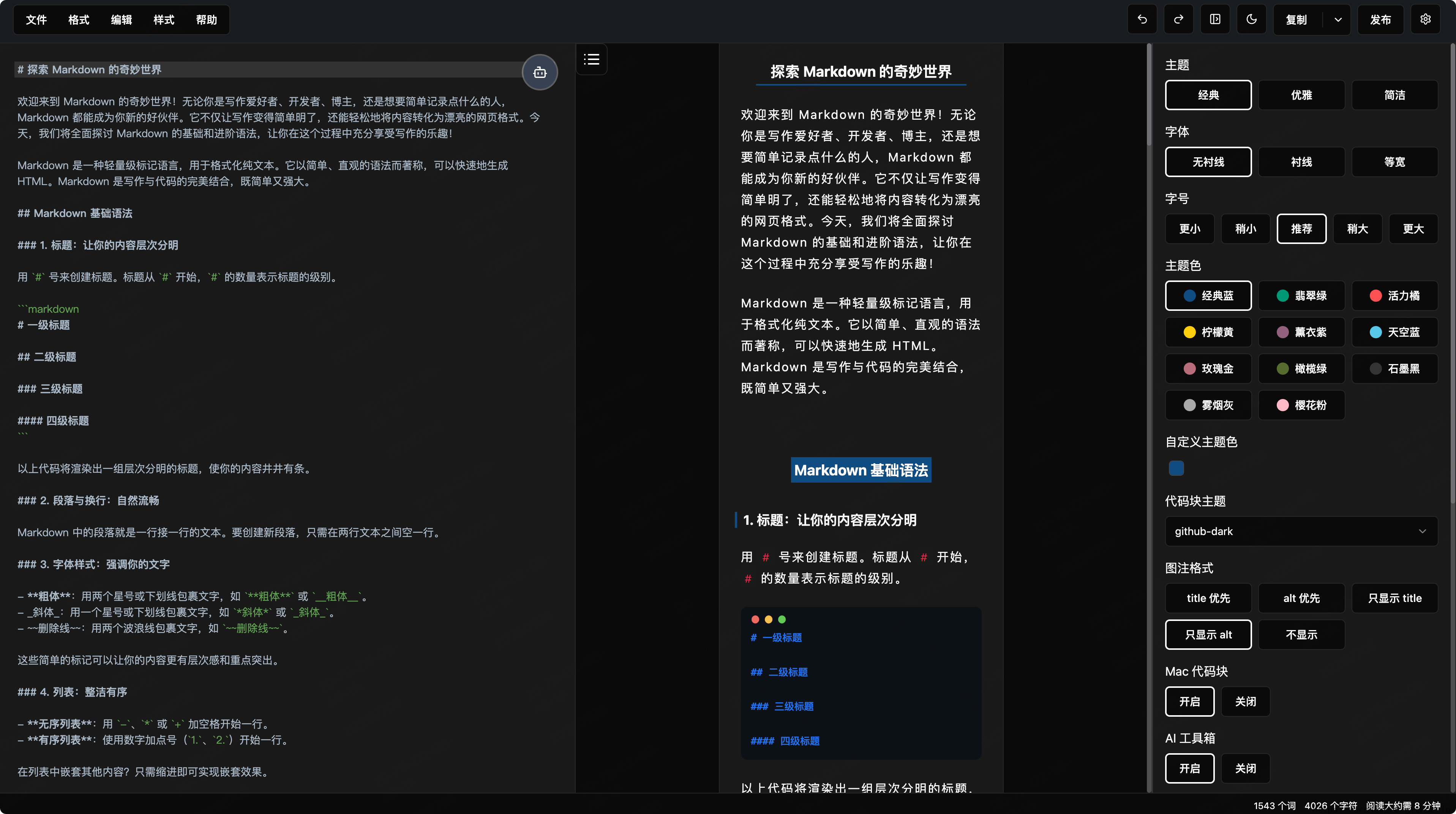 - 丰富的代码块高亮主题,提升代码可读性