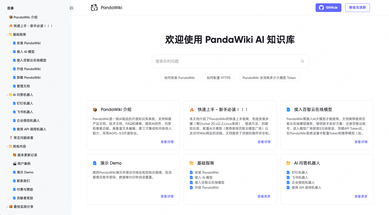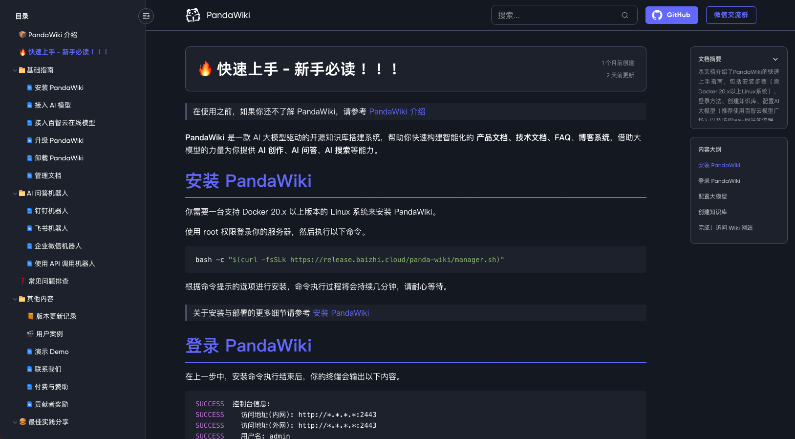 PandaWiki 是一款 AI 大模型驱动的开源知识库搭建系统,帮助你快速构建智能化的 产品文档、技术文档、FAQ、博客系统,借助大模型的力量为你提供 AI 创作、AI 问答、AI 搜索 等能力。