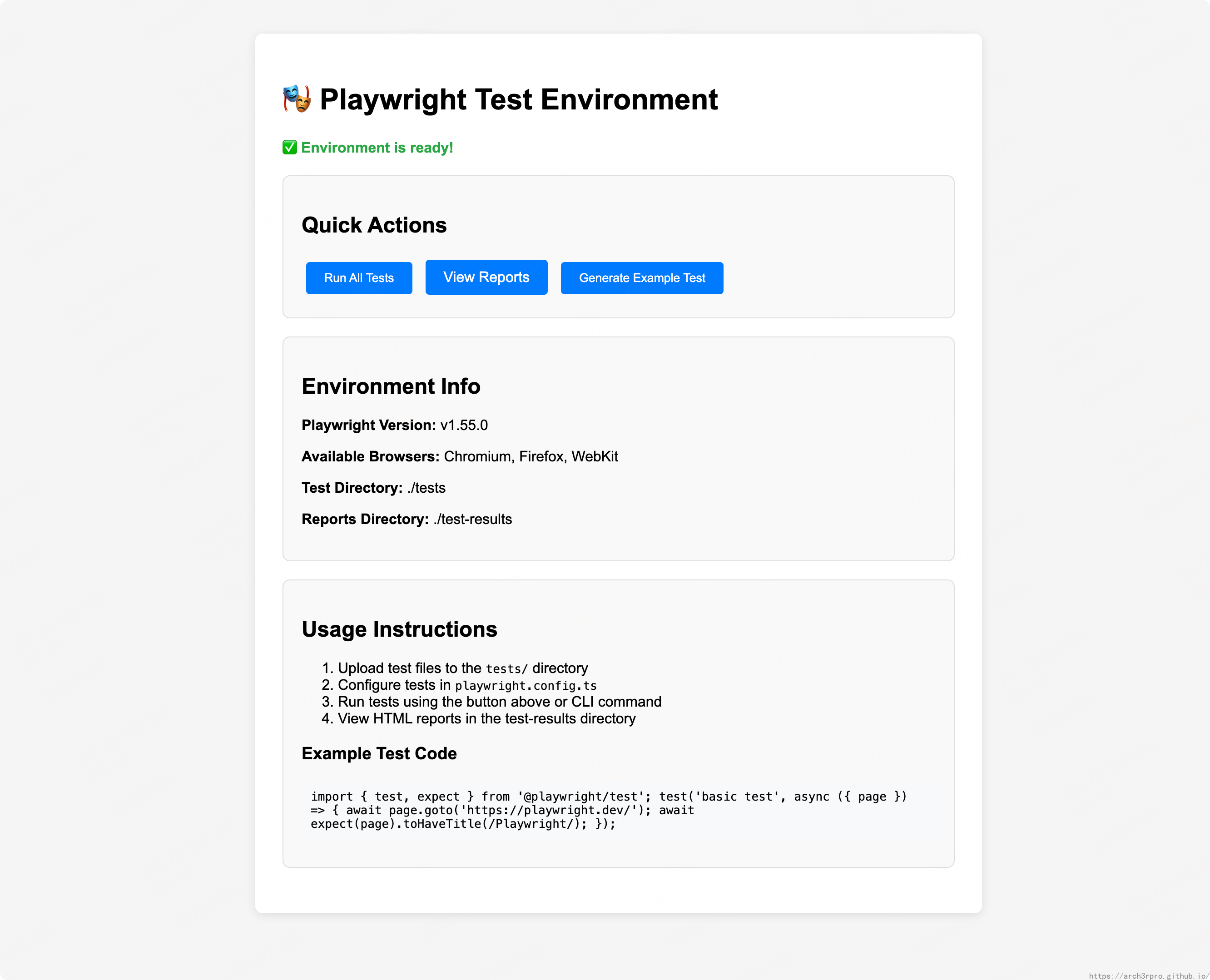 config/start.sh来调用您的自定义脚本:#!/bin/bash echo "🎭 Setting up Playwright Test Environment..." # 确保目录存在 mkdir -p tests test-results # 安装依赖 echo "📦 Installing dependencies..." npm install # 安装 Playwright 浏览器 echo "🌐 Installing Playwright browsers..." npx playwright install # 运行您的自定义脚本 echo "🔧 Running custom script..." node my-custom-script.js # 启动服务器(可选) echo "🚀 Starting Playwright server..." node server.js