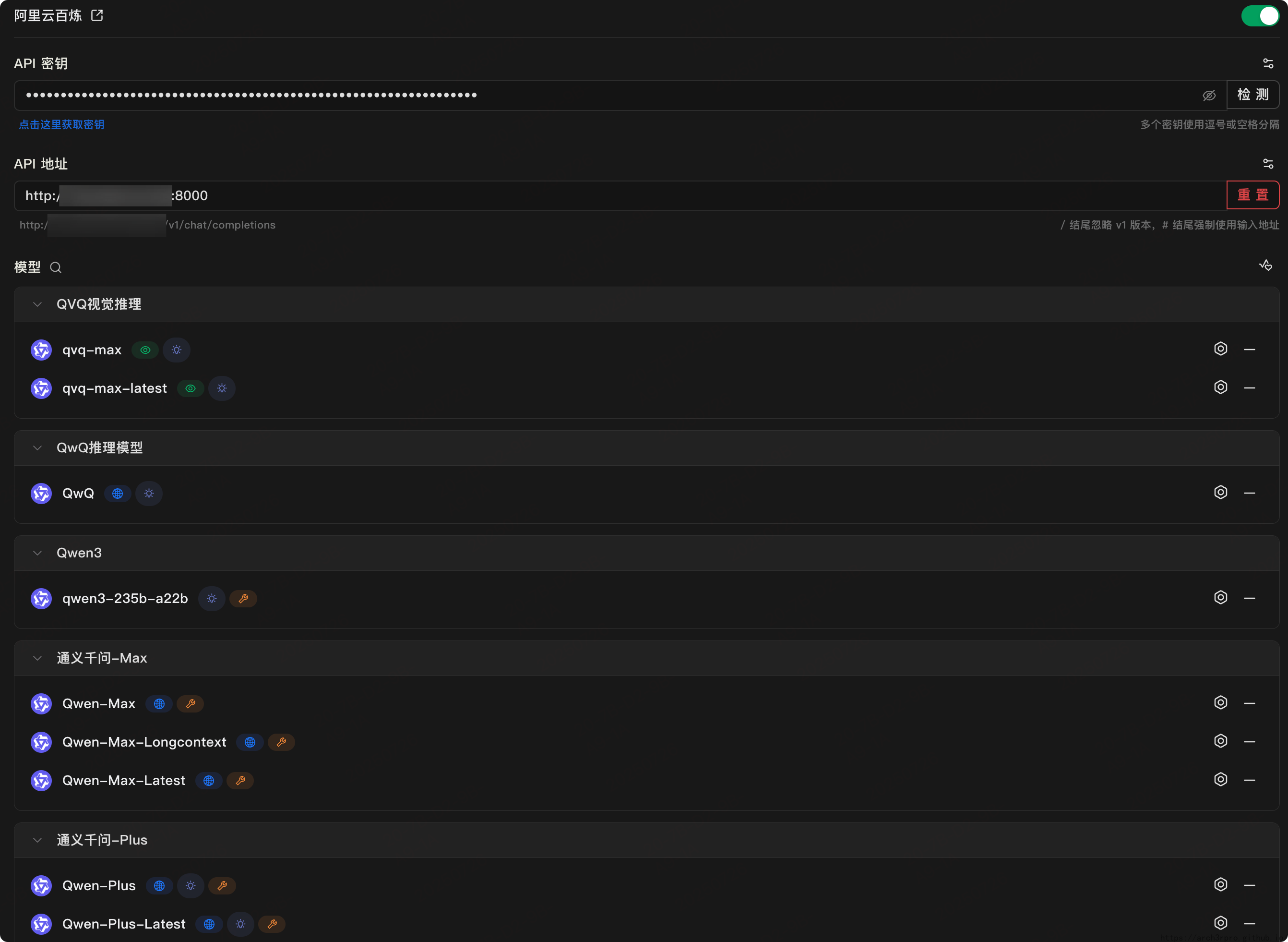 当前版本支持Qwen3和Qwen3-Coder等模型使用,需要手动添加模型,模型ID为qwen3-coder-plus, 模型名称随便填写