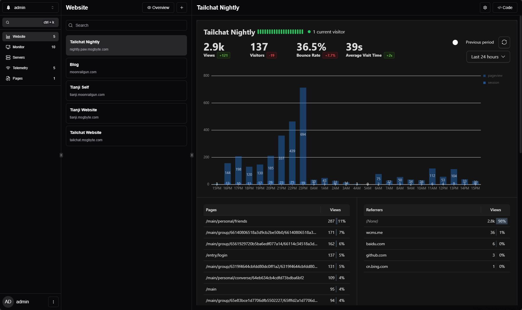- 网站流量分析:只需一段小于2KB的脚本即可监控网站的 PV/UV、在线时长、跳出率、访客设备使用情况、地理位置、访问来源等信息,可理解为自托管版的 Google Analytics。